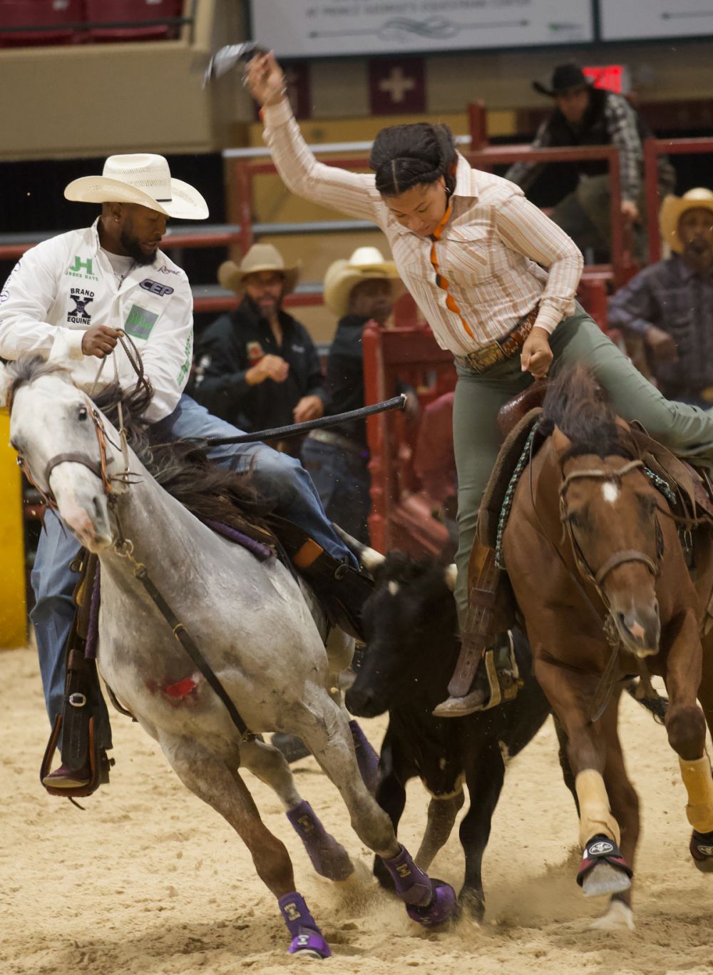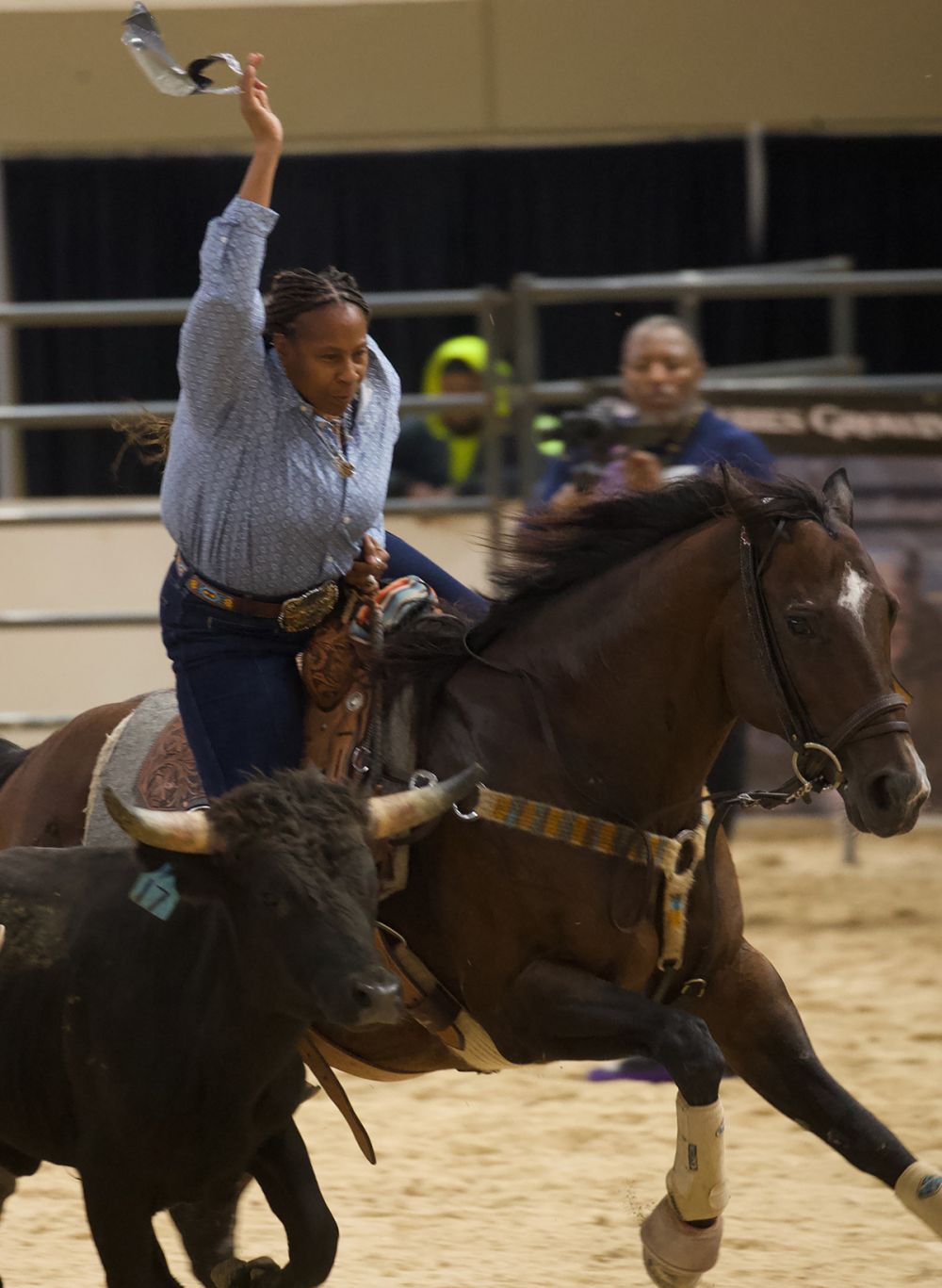 Once the contender has successfully removed the ribbon, she raises the ribbon high overhead to signal to the judge she is finished. All this happens as fast as the steer can run and requires tight coordination between rider and horse.
